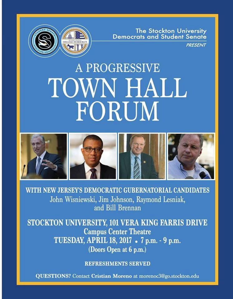 "The Stockton University Democrats and Student Senate Present: A Progressive Town Hall Forum with New Jersey's Democratic Gubernatorial Candidates! Doors open at 6 p.m. Forum starts at 7:00. Free Pizza and Refreshments Provided!"