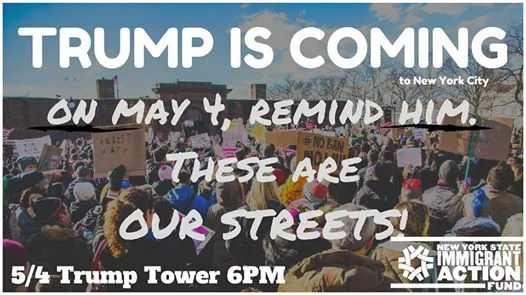 "On Thursday, May 4, Trump thinks he's going to come back to New York City, but we're going to remind him and the whole country who these streets belong to, the PEOPLE! Join us as we take over the streets around Trump Tower and make sure he knows what real New York values are about. We'll gather at 54th and 5th Ave at 6PM.